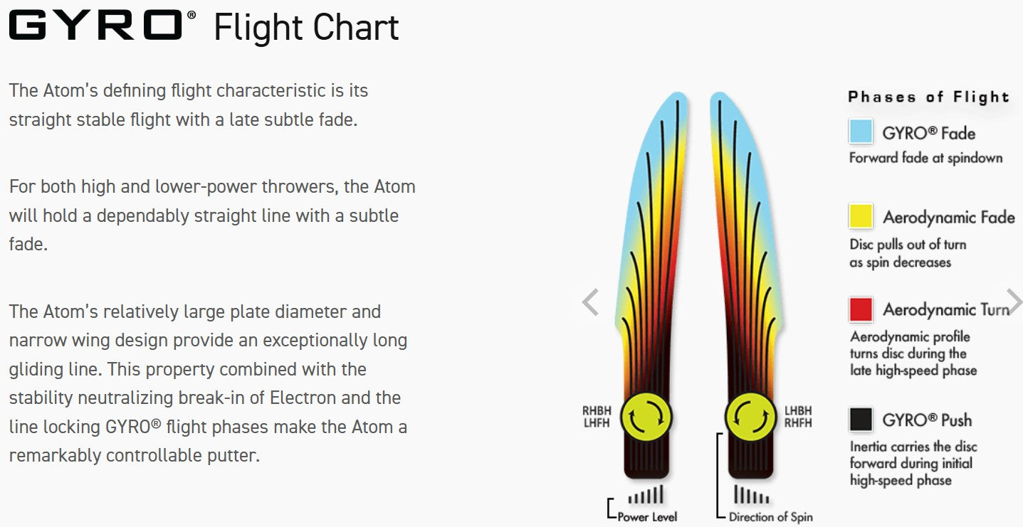 The Atom is a straight flyer with enormous potential off the tee and on long approaches. Right off the shelf, the Atom has a neutral stability with just a bit of fade. In premium GYRO® plastics the Atom will retain its neutral stability indefinitely. In Electron baseline plastic the Atom will wear into an extremely straight and floaty putter, with extra tactile feedback inside the circle or in adverse weather.