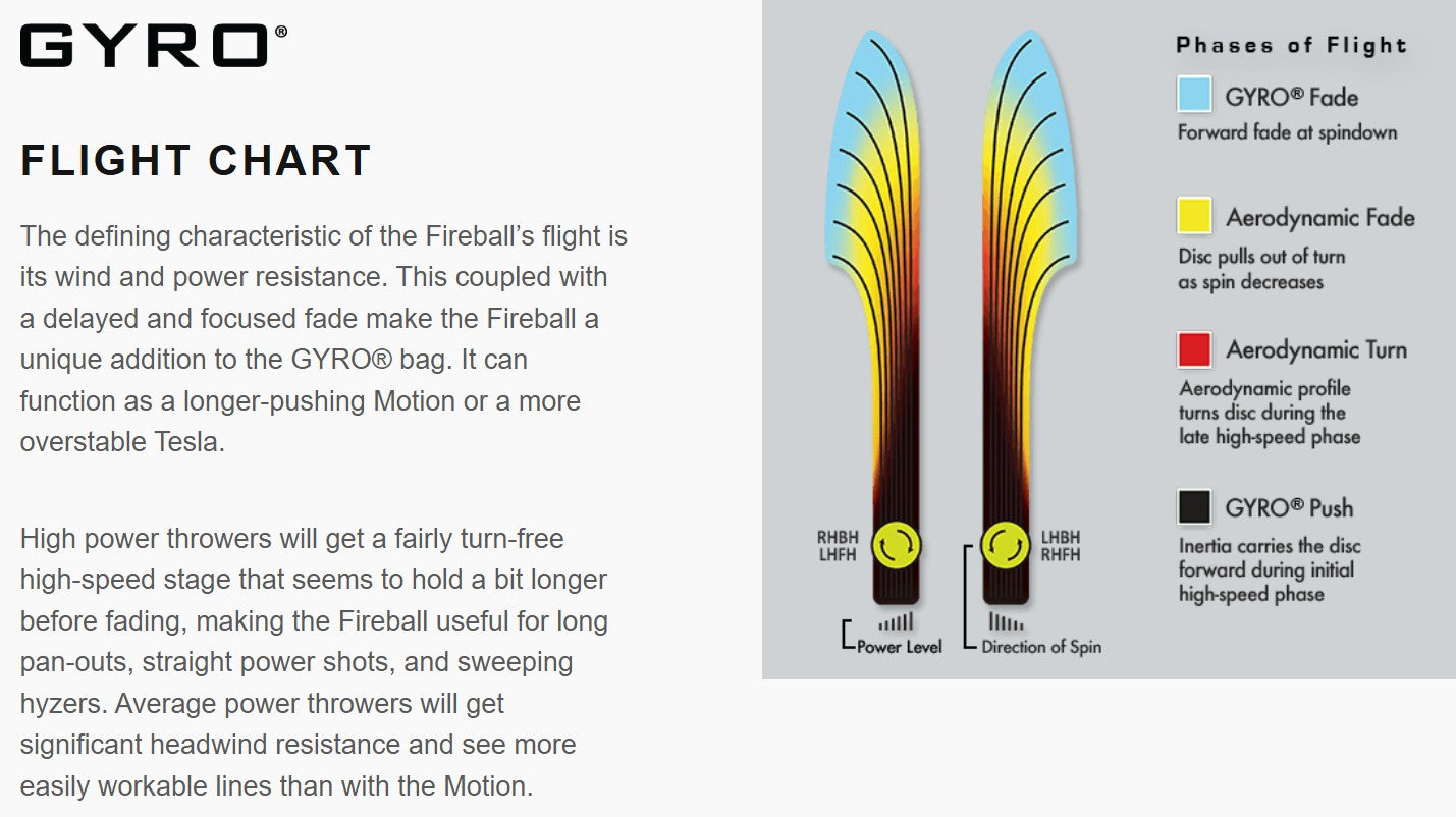 The Fireball is overstable and wind-resistant like the MVP Motion but has an overall straighter and longer flight profile. The Fireball has a longer forward push during its early stage of fade, where the Motion would have begun a long gradual fade. At the end of its flight, the Fireball will drop later and more abruptly than the Motion.
