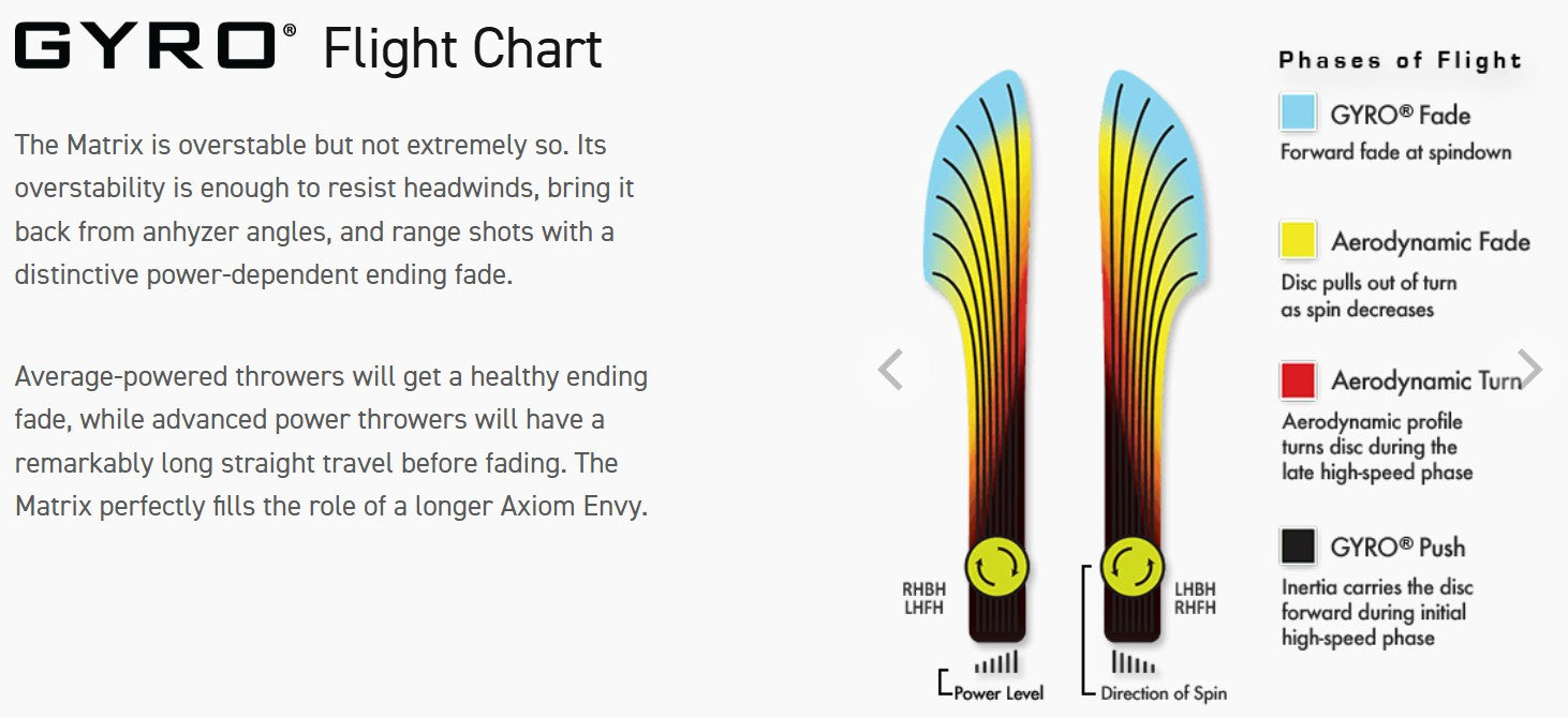 The Matrix is designed to resist turnover for all power levels and situations, and its stability is best described as a longer Axiom Envy. Matrix should have a long straight travel for most throwers, followed by a dependable fade. While this is not a “meathook” style overstable midrange, its utility is not to be underestimated. Release angles make all the difference with this type of midrange, yielding useful flights on releases from anhyzer to flat and hyzer.