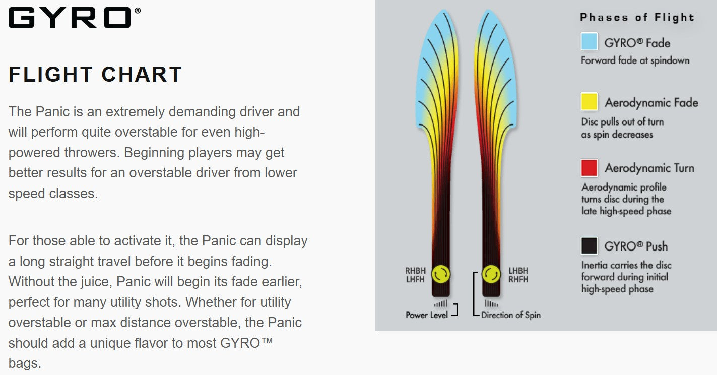 The Panic is thoroughly overstable, with plenty of beef to handle headwinds and torqued-up sidearms. Its overstability holds the Panic on any kind of hyzer line and allows steep anhyzer flex shots. For high-power throwers, the Panic will be a useful utility driver, while newer and average throwers will get an extremely overstable flight. The Panic is best described as a seasoned MVP Nitro.